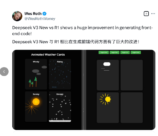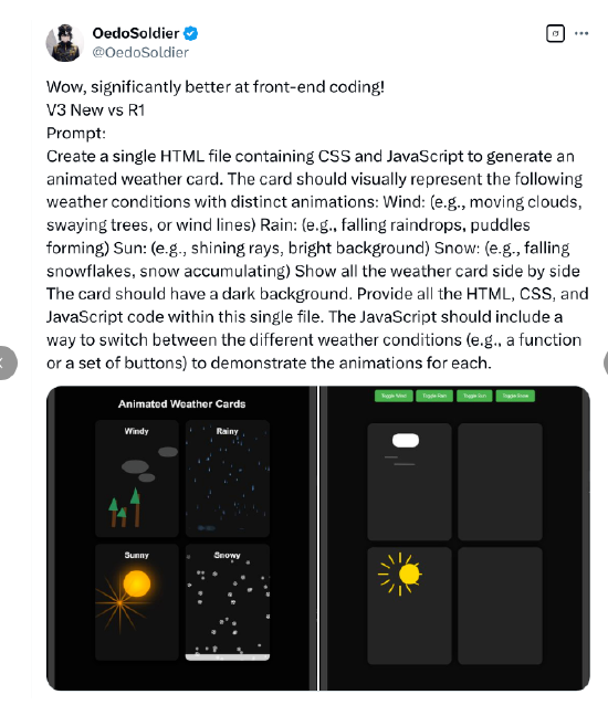 · 与 R1 相比,V3-0324 在生成前端代码方面有了明显改进。